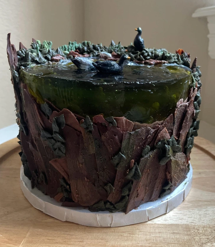 «Испекла папе на день рождения вот такой торт. Все съедобно! Кроме уточек»