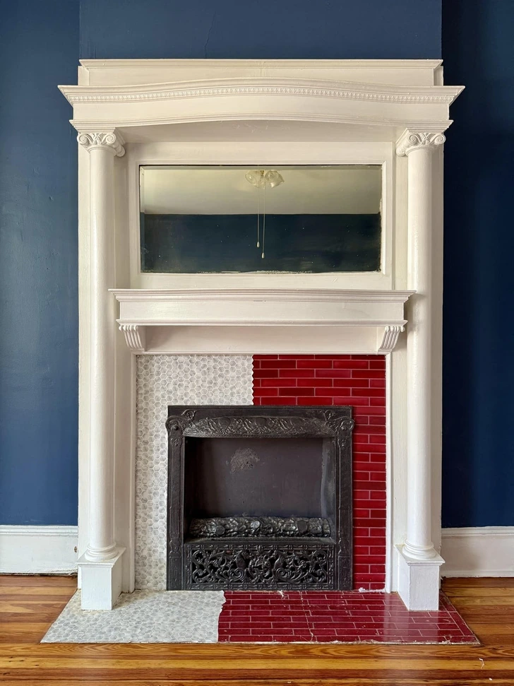 «Обнаружил красивую облицовку камина под кирпич под уродливыми белыми наклейками, которые остались от предыдущего владельца нашего старинного дома»