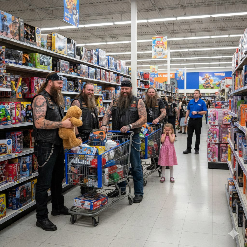 Сначала люди вокруг не поняли, что происходит. Но когда сорок взрослых мужчин в кожаных жилетах разошлись по рядам и начали наполнять тележки куклами, конструкторами, наборами для творчества, мягкими игрушками и настольными играми — воздух в магазине будто изменился. Стало тише, теплее, человечнее.