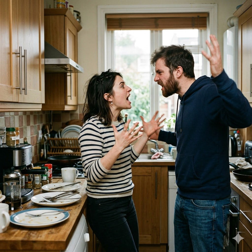 Денис сильно обиделся на жёсткие слова жены и начал кричать ещё громче. Лицо его покраснело, вены вздулись на шее.