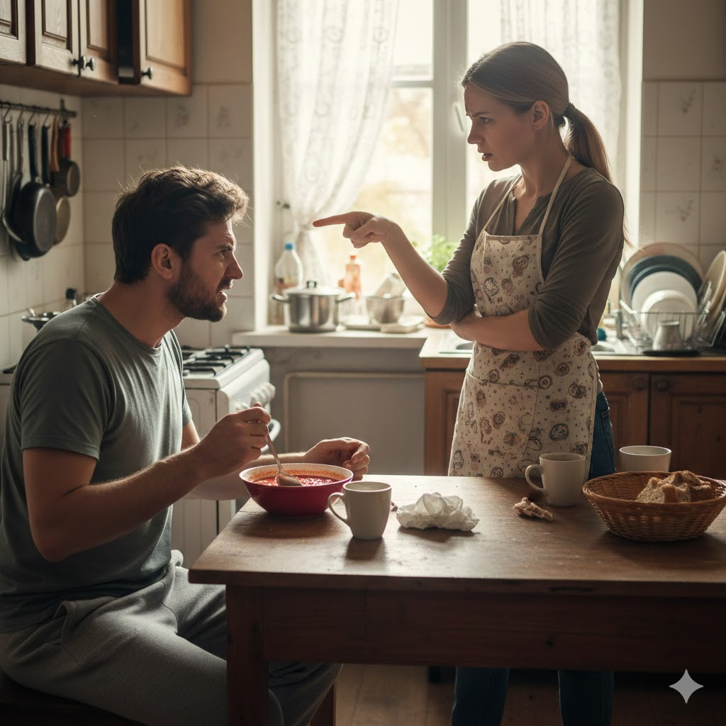 — Ах, значит, мой суп для тебя — помои, а мамины котлетки — шедевр кулинарии? Ну так и жри у своей мамочки, а ко мне за стол больше не садись! Я не нанималась служанкой, чтобы выслушивать твоё нытьё!