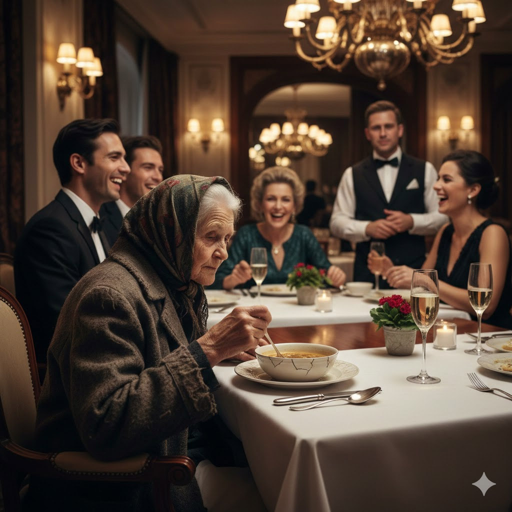 Услышав этот разговор, несколько мужчин за соседним столиком начали громко смеяться. За ними подхватили другие — кто-то шептал с насмешкой, кто-то криво улыбался. Словно по залу прошёл лёгкий смешок презрения. “Пришла нищенка, чтобы поесть супа среди богатых”, — шептали.