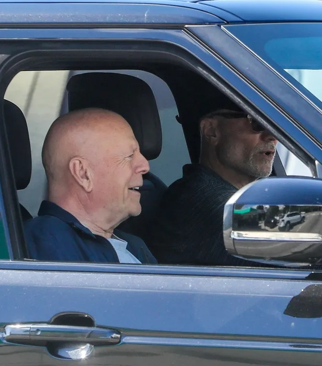 На Брюсе были светло-серая футболка и темно-синяя куртка. Он выглядел в хорошем настроении, сидя на пассажирском месте и оживленно разговаривая со своим спутником. На его лице читалась почти детская непосредственность, а широкая улыбка придавала ему особенно теплый вид. Несмотря на серьезность своего состояния, актер, казалось, наслаждался солнечным теплым днем в компании друга.