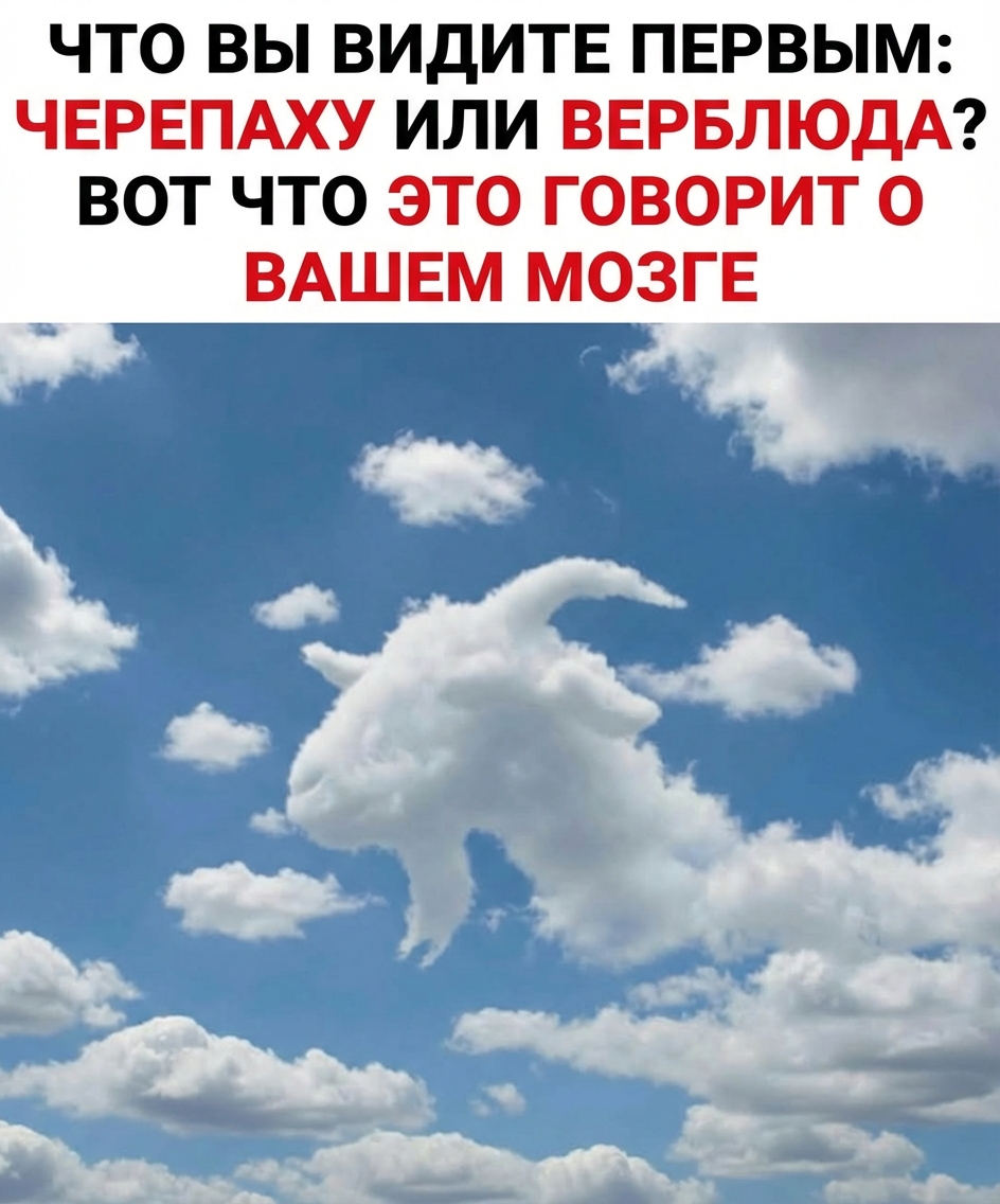 Да, каждая из нас хоть раз видела облако, похожее на сердце, животное или даже на сказочного персонажа. Это — глубоко человеческий рефлекс! Наш мозг просто ненавидит неопределенность и всегда стремится придать значение всему, что видит. Самое интересное? То, что вы замечаете первым, может рассказать о ваших глубинных природных склонностях. Этот простой визуальный тест – идеальное тому подтверждение: черепаха или верблюд? Ваш мгновенный ответ может стать ключом к пониманию того, как вы функционируете в повседневной жизни!