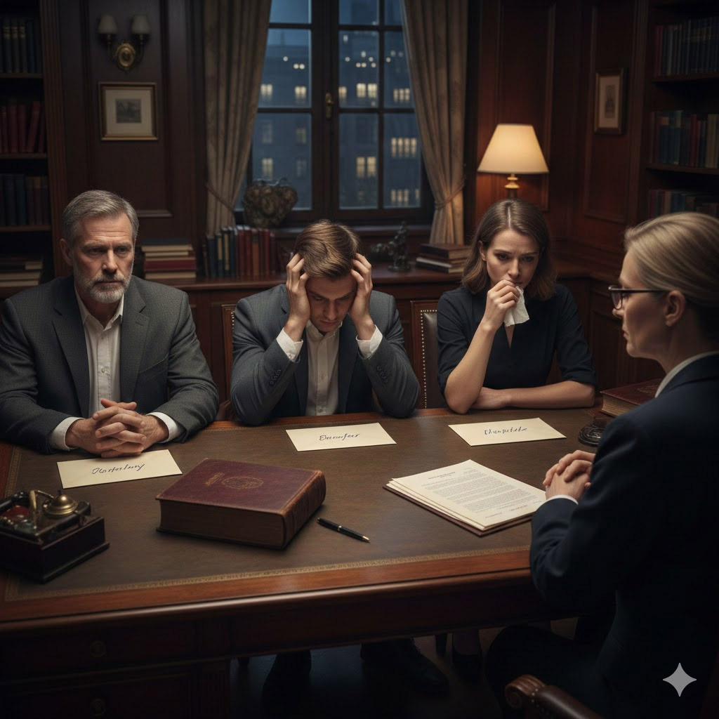 В комнате было душно. Нотариус, сухой человек в очках, сидел во главе стола. Перед ним лежал один-единственный, пухлый белый конверт.