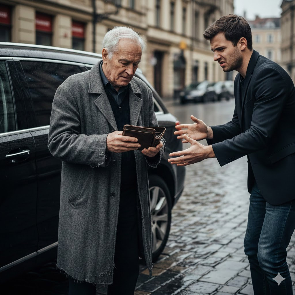 Он стоял под дождём, мокрый, жалкий, со своим тугим кошельком, который теперь казался ему бесполезным куском кожи.