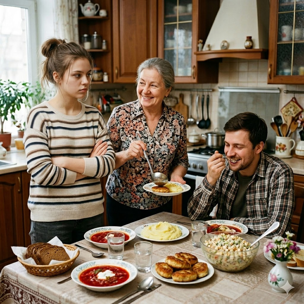 — Вот у мамы, — мечтательно сказал он, закатив глаза, — борщ — это песня. Ложка стоит сама! А тут… Ну, водичка какая-то. Вкусно, конечно, но не то. Не мамин.