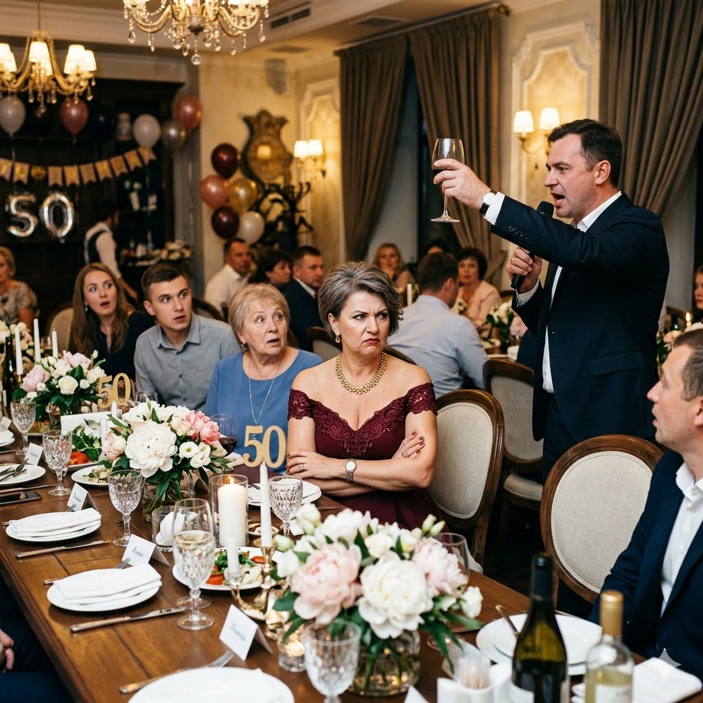 — А давайте, друзья, пожелаем, что наша именинница всё-таки дожила до пятидесяти пять в добром здравии! — объявил он на весь зал. — Это сейчас редкость, особенно для женщин, которые столько всего пережили. Стрессы, разводы, одиночество… Дожить — это уже само по себе подвиг!
