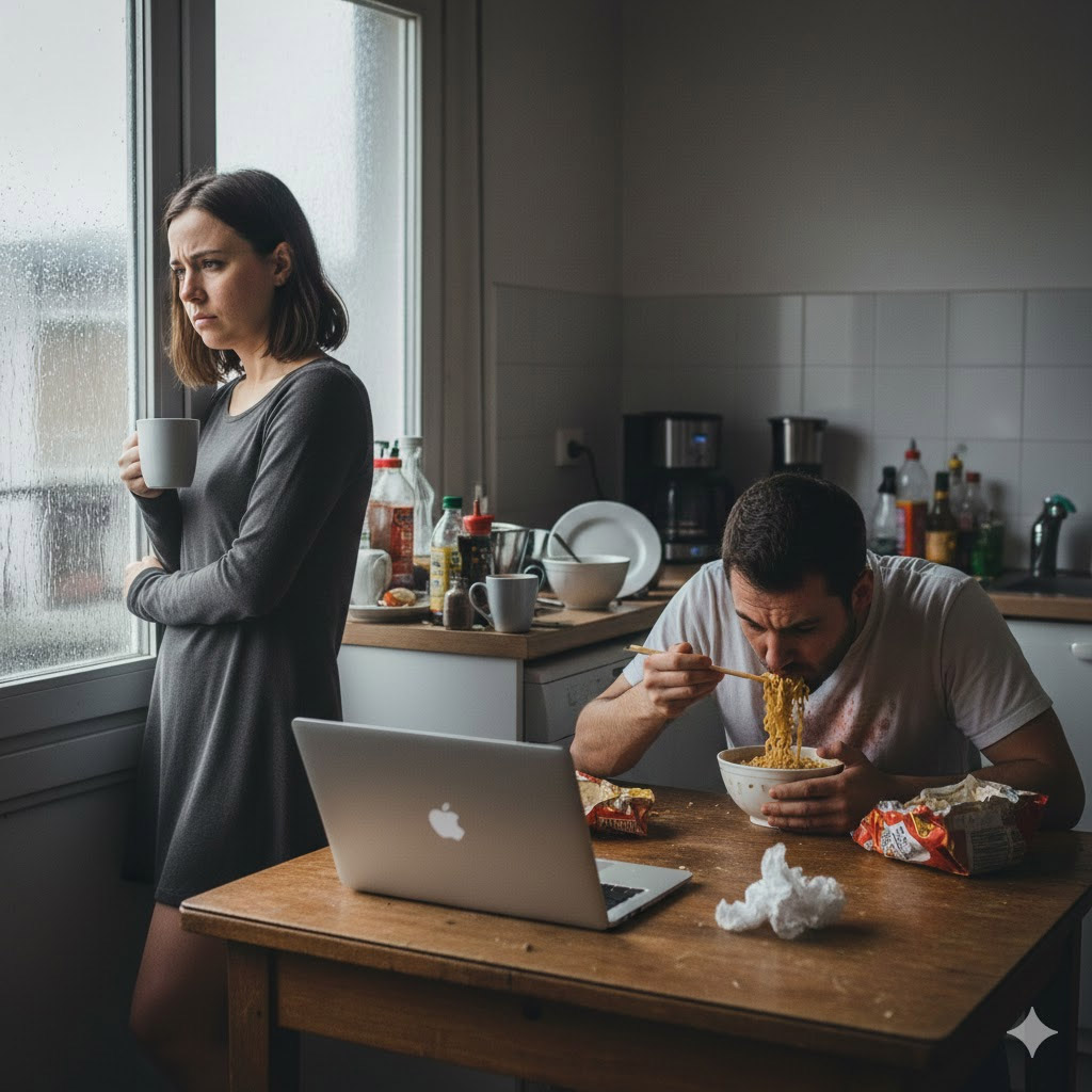 Антонина сидела за кухонным столом и смотрела, как муж поглощает очередную порцию заказанной лапши. Ел он жадно, неряшливо, капая соусом на футболку.