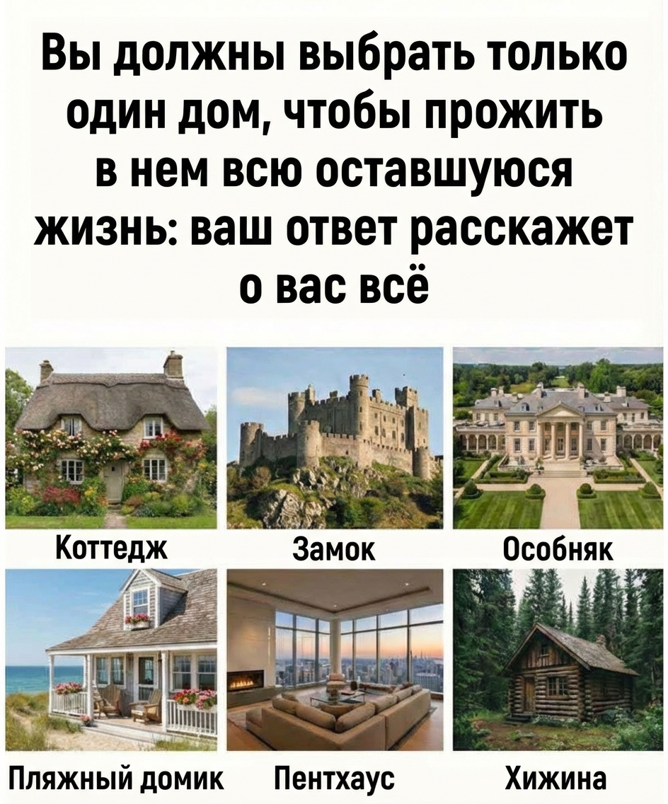 Но самое интересное в другом! Ваш выбор — это не просто предпочтение. Это глубокое отражение вашей души, ваших скрытых желаний и истинных приоритетов. То, какой дом вы выберете, способно с головой выдать ваши самые тайные черты характера, показать, чего вы на самом деле ищете в жизни и что для вас по-настоящему ценно. Приготовьтесь узнать о себе нечто совершенно неожиданное!
