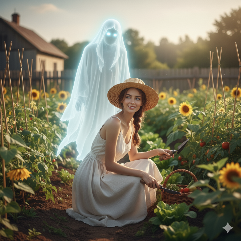 В одну из ночей она снова вышла на балкон. Участок больше не был чёрным. Сквозь землю пробивались тонкие зелёные ростки. И в их тени стоял мужчина — но теперь светлый, прозрачный. Он смотрел на неё и улыбался.
