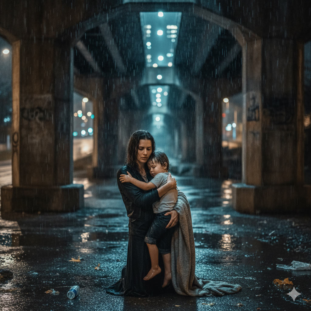 Она спустилась по скользкому склону, цепляясь за мокрые камни. Луч света выхватил из мрака маленькую фигурку ребёнка, прижавшегося к бетонной опоре. Босые ноги, лёгкая рубашка насквозь промокшая, тело покрытое грязью.