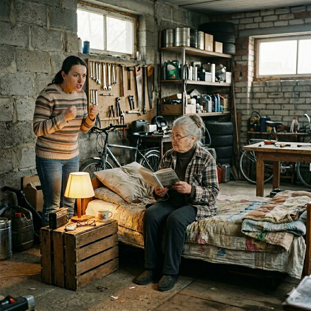 Дверь поддалась с тяжелым скрежетом. В лицо ударил запах, который не спутаешь ни с чем: смесь старых лекарств, немытого тела и дешевого бульона из пакетиков. В углу, среди коробок из-под запчастей и зимней резины, стояла узкая кровать. На ней, сжавшись в комок под слоями засаленных одеял, сидела маленькая сгорбленная женщина. В руках она судорожно сжимала старый учебник химии.