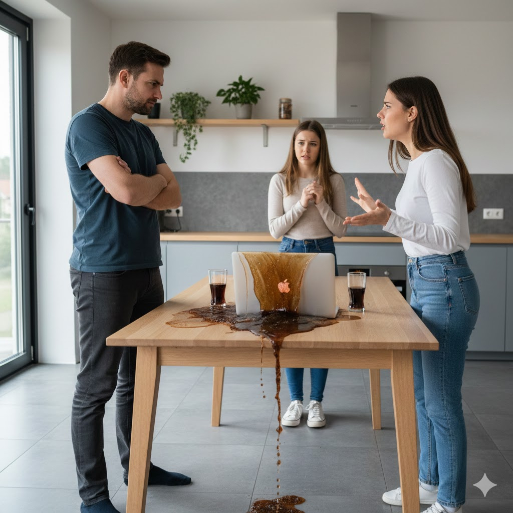 Первые несколько секунд никто не двигался. Лена ахнула, прикрыв рот рукой. Никита, испугавшись внезапной тишины и погасшего экрана, насупился, готовый разреветься. А Виктор… Виктор просто смотрел на тёмную лужу, растекавшуюся по серебристому корпусу, с выражением лёгкого недоумения на лице.