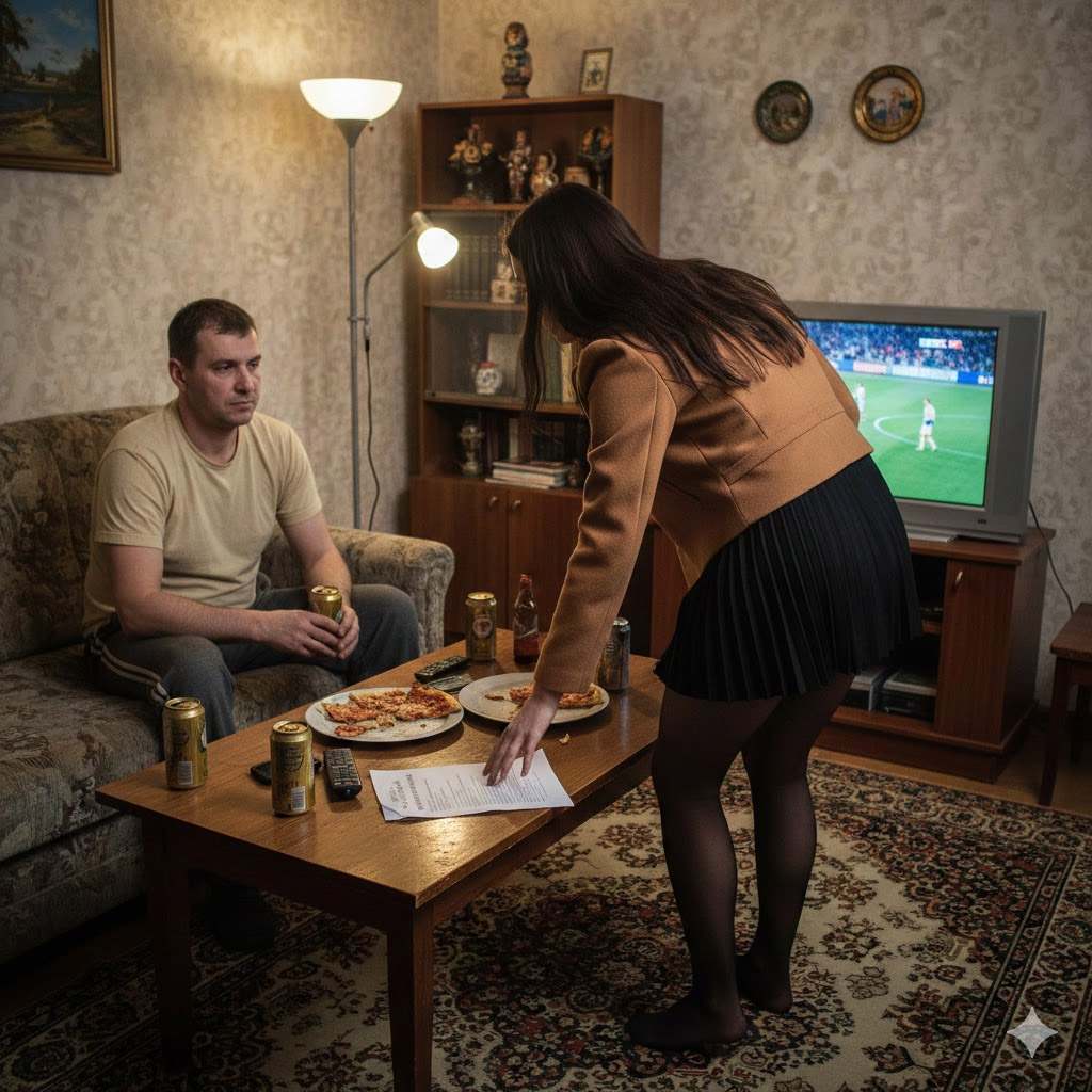 Марина вернулась в комнату и молча положила смятый чек на журнальный столик, прямо поверх кусков засохшей пиццы. Бумажка медленно развернулась, демонстрируя жалкие цифры. Андрей скосил глаза, но тут же отвернулся к телевизору, делая вид, что происходящее на экране его волнует больше, чем присутствие жены.