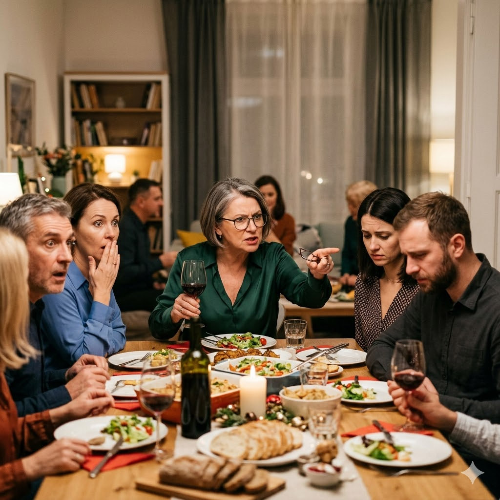 В гостиной воцарилась театральная тишина. Родственники мужа, до этого бодро работавшие челюстями, замерли с вилками в руках. В воздухе повисло предвкушение грандиозного скандала — бесплатный цирк за семейным столом всегда слаще любого десерта.