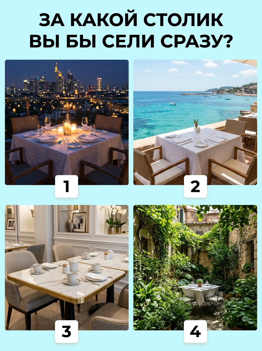 Представьте, что вы оказались в волшебном месте, где время словно остановилось. Перед вами четыре совершенно разных столика, каждый из которых обладает своей неповторимой атмосферой. Место, которое вы выберете интуитивно, в этот самый момент, может многое рассказать о том, чего именно сейчас жаждет ваша душа.
